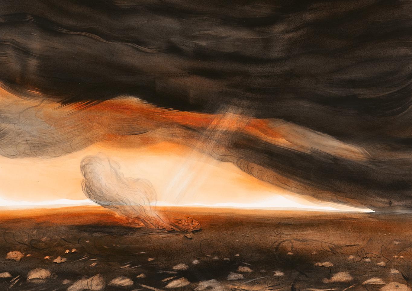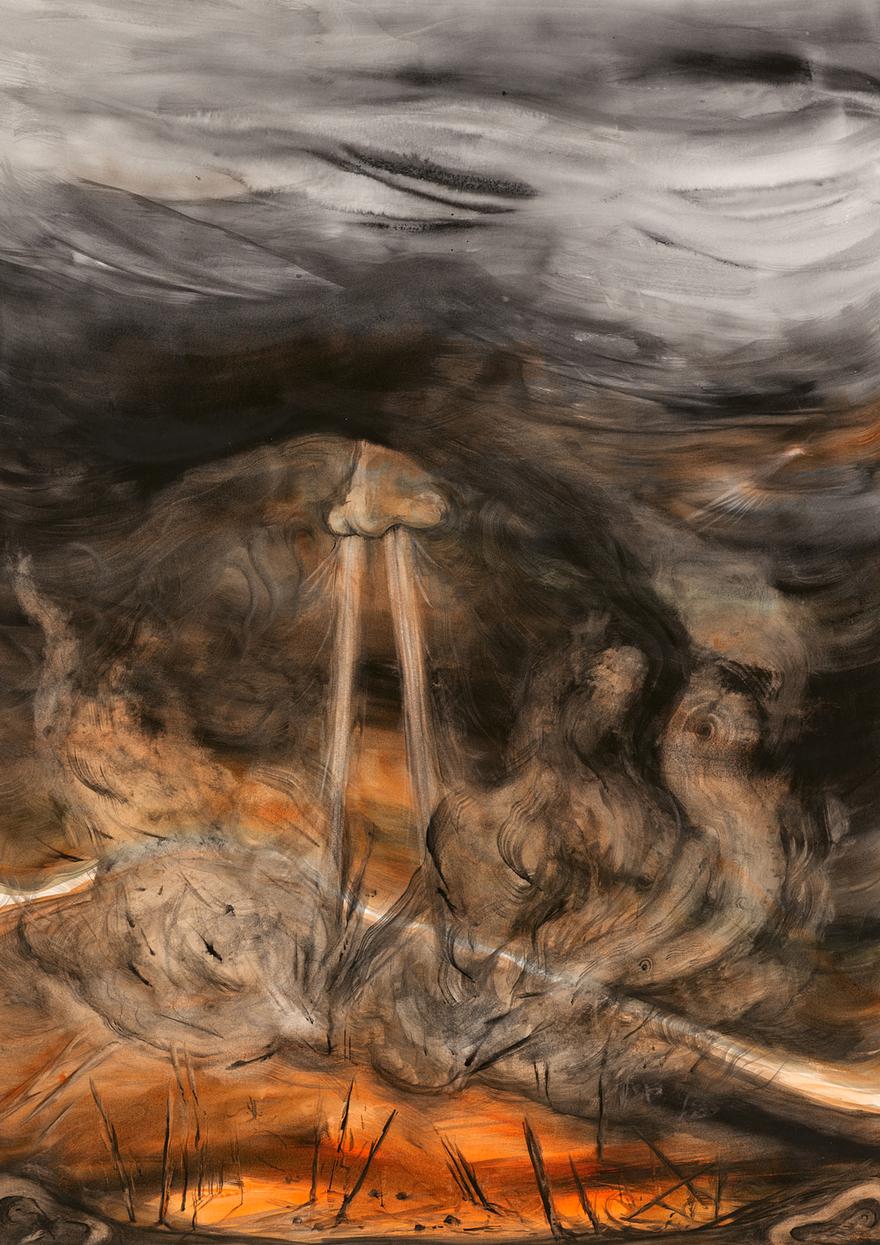 Avi Sabah's (b. 1977, Ma'alot Tarshiha, Israel) work has evolved, from the very outset, through a search for correspondence between physical substances and emotional dispositions, such as between fog as an atmospheric phenomenon and fog as a state of consciousness. His early works pushed the boundaries of matter in the most concrete sense, employing "non-standard" materials, such as cooking oil or tar, and acts such as burning works or burying them in the ground. These practices were formulated in the terms of alchemy, which is concerned with transmutation and animation of matter. Sabah works in series. In his studio routine, large bodies of work that share common material and visual themes gradually come together. The featured series—The Great Smoker, Second Wind, Tends to be Forgotten, Lately—share a constant format, the same type of paper, and unique imagery.