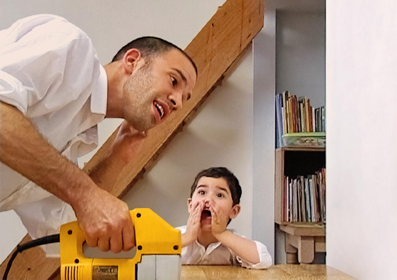 Ben Ner gained worldwide recognition with works that interweave his personal life with timeless myths and with seminal literary and cinematic works. His early films engage with the tension between his practice as an artist and fatherhood and family life. They are rooted in the domestic, everyday environment, while relying on familiar cinematic genres: silent cinema, sitcoms, nature films, instructional films and more. In contrast to the highbudget film and television industries, Ben Ner deliberately creates his films with what is most readily available to him: his family members, his home, public spaces, and of course himself. In a spirit of improvisation and inventiveness, he presents a model for inexpensive cinema — and economic independence also becomes part of the message. Many of Ben Ner's works present artistic “guerrilla acts,” such as filming without a permit, using public areas, stealing soundtracks, and vandalizing property. Navigating between private and public spaces, he emphasizes the decisive influence that society, the economy, and politics have on the most intimate relationships —marital and family ties.