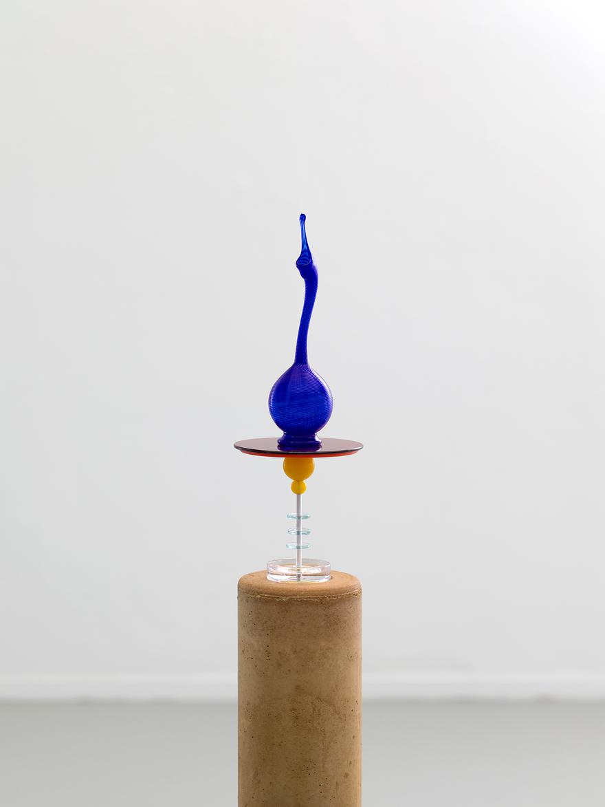 Blown blue soda-lime glass receptacle, blowtorched borosilicate glass disc stand with brass frame, rammed earth foundation