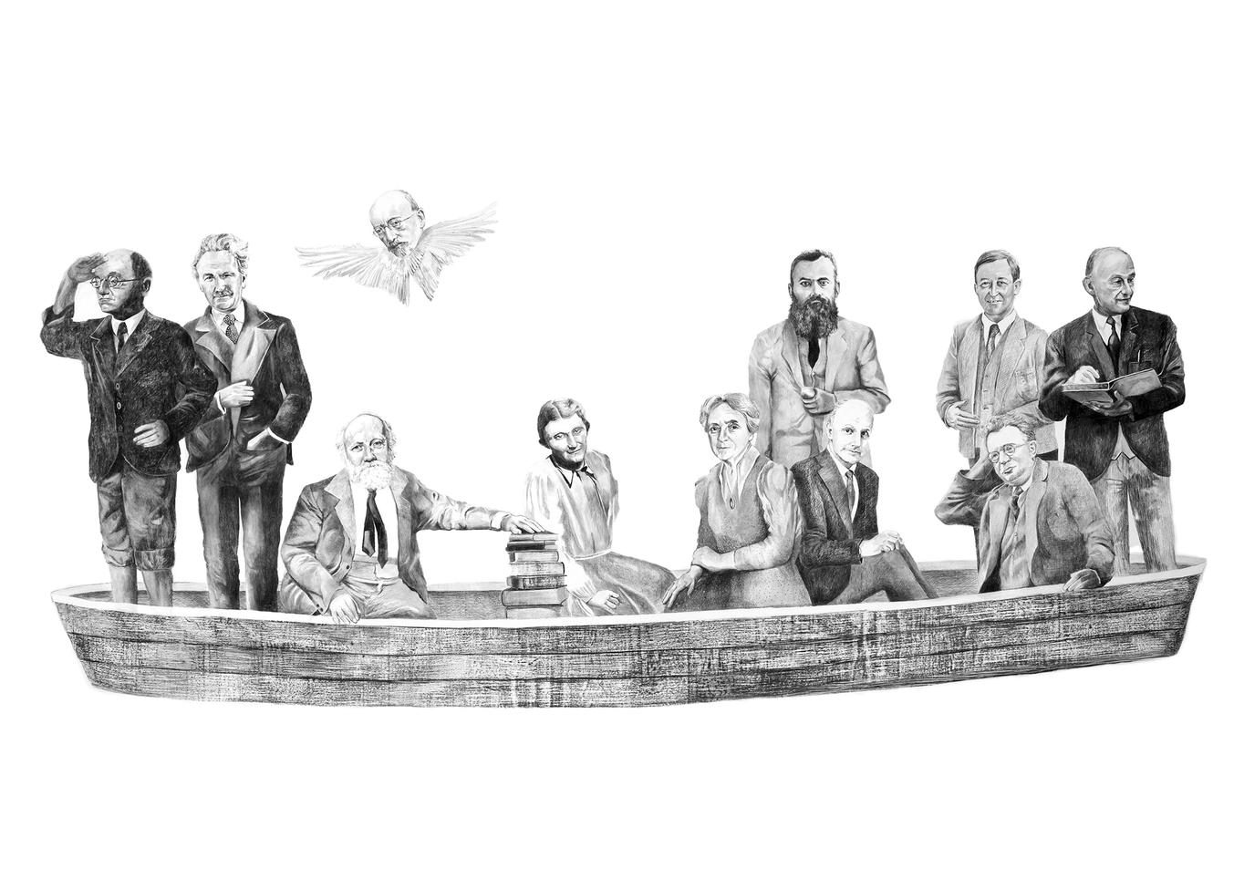 Via monumental charcoal drawings of boats sailing in empty space, carrying figures and symbols from the past, the artist traces ideas that have been pushed to the margins—including Herzl's utopian vision for the Jewish state; the diaspora as an ideology in the Bundist vision ("Wherever we live, that is our land!"); the yearning to return to the biblical way of life, while skipping over 2,000 years of exile; the Canaanite attempt to connect the Jewish nation to the local space based on ancient Hebraism; the roots of the link between the Jewish, Mizrahi, and Arab identities.