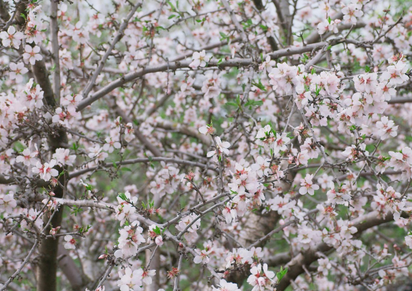 Sigalit Landau’s almond tree fills the screen with its blossom when one of the tree branches is suddenly forcefully shaken, and the white-pink petals fall like snow on the ground to the sound of a string instrument. Landau weaves a violent dance of the almond tree flowers with the shaking branches by editing the sequence forward as if willing the fallen petals to blossom again. [Lower Galilee]