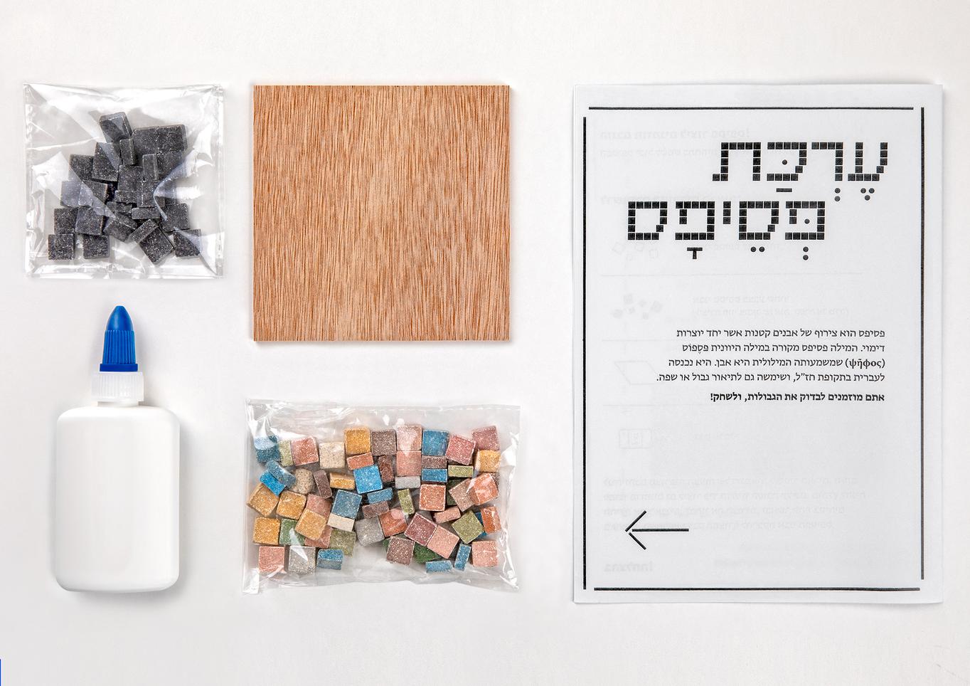 הערכה כוללת אבני פסיפס צבעוניות ושחורות, מצע מעץ להדבקתן ודבק פלסטי.