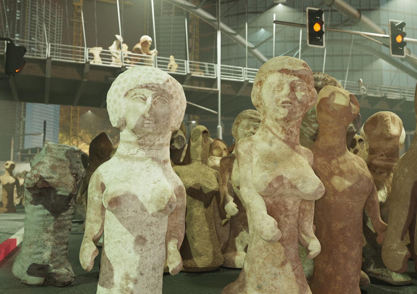 באמצעות טכנולוגיה מתקדמת היא מנפישה צלמיות פריון עתיקות שנמצאו באזורנו כאוואטריות שלה ושל הנשים החיות בסביבתה. ארץ אֵם מעלה שאלות על בחירה חופשית, שליטה בפריון ואימהוּת כעיסוק עכשווי ששורשיו קדומים.