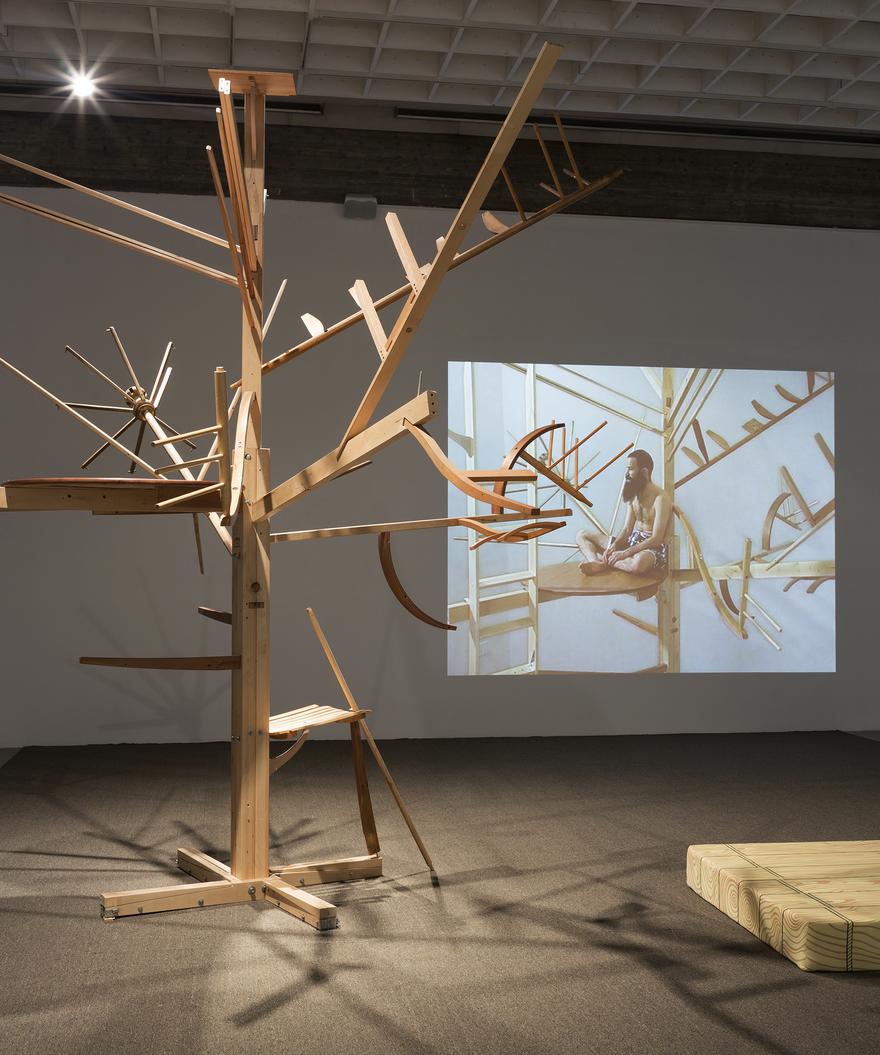 Wood, mattress, synthetic carpet, and DVD, h 290 cm, 10 min