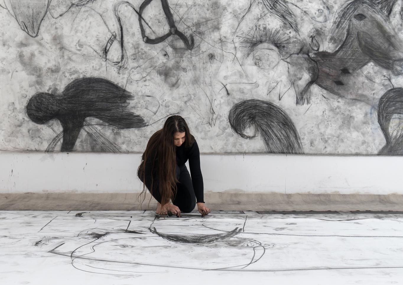 Maria Saleh Mahameed (b. 1990, Umm al-Fahm; lives and works in Ein Mahel) presents a body of work created during the months of war. The monumental charcoal drawings on swaths of cloth were made in her signature practice, working directly on the floor, imprinting her body's traces onto them. Her works are filled with drama and mystery, drawing inspiration from sources that range from ancient history to the contemporary moment; from prehistoric cave paintings to artists such as Edvard Munch, Ana Mendieta, and William Kentridge.